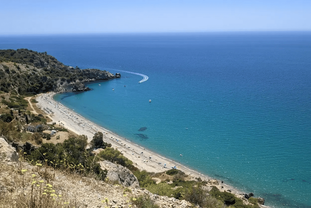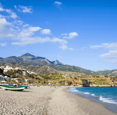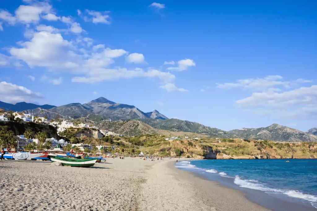 Burriana Beach in Nerja is one of the most loved spots on the Costa del Sol, and it deserves the attention. The bay is wide with soft sand and clear water, backed by a gentle promenade lined with chiringuitos, beach shops and laid back bars. It has a relaxed holiday feel without losing its local charm. You can rent sunbeds, try water sports, walk to the Balcon de Europa or simply sit with a plate of paella and watch the day drift by. It works for families, couples and friends who want an easy, sunny base by the sea all day long.