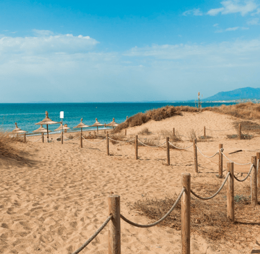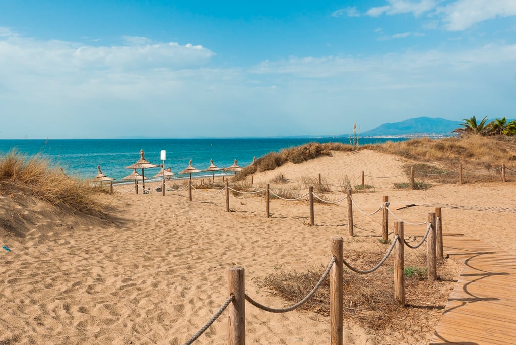 For a more natural vibe without going remote. Fine sand, shallow water, protected dunes and a small marina. Best for travellers who like space, calmer surroundings and still being a short drive from Marbella.