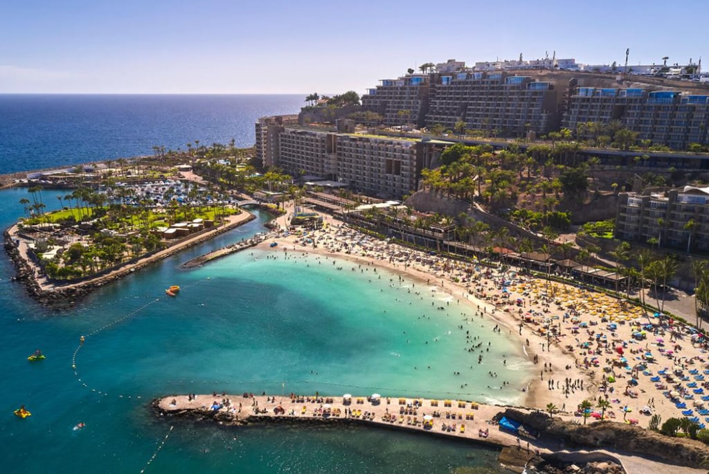 Playa Anfi del Mar sits on the south west coast of Gran Canaria and feels like a carefully crafted tropical escape. The bay is sheltered and the water almost always calm, with pale sand that gently shelves into clear turquoise sea. Palm trees and gardens surround the beach and a small marina completes the picture.