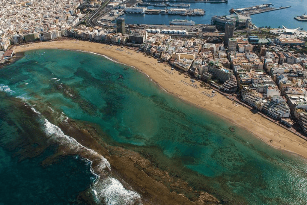 Playa de Las Canteras in Las Palmas is one of the finest city beaches in Spain and a favourite for both locals and visitors. The bay stretches for nearly three kilometres and is protected by a natural reef that keeps the water calm and clear. This makes it ideal for swimming, paddleboarding and snorkelling among colourful fish close to the shore.