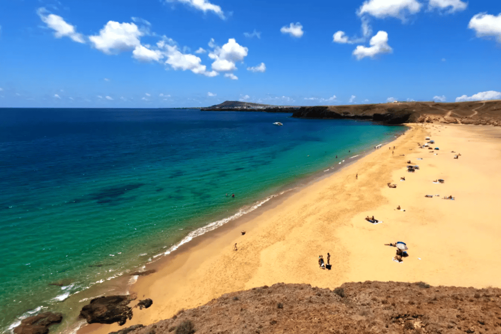 Playa de Papagayo is Lanzarote’s most iconic cove and a must visit on any island holiday. Tucked inside the Los Ajaches Natural Park, this small sheltered bay has golden sand, calm emerald water and rocky hills that protect it from the wind. It is perfect for swimming, snorkelling and lazy days in the sun. A short walk up the cliffs gives you wide views over the coast and, on clear days, across to Fuerteventura. Simple beach bars keep the atmosphere relaxed and natural. Papagayo is one of the best beaches in Lanzarote for visitors who want clear water, soft sand and unforgettable sunsets in an unspoilt setting.
