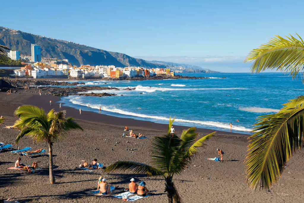 On the western coast near Santiago del Teide, Playa de la Arena is known for its dark volcanic sand and deep blue water. The contrast between the black shore and the bright ocean creates a striking scene that feels uniquely Tenerife. The beach is compact but welcoming, surrounded by restaurants, cafés and sea view terraces.