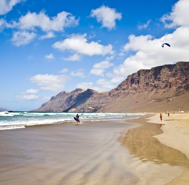 Playa de Famara captures the wild and untamed beauty of Lanzarote. Located on the island’s north-western coast, this vast stretch of golden sand is framed by the dramatic cliffs of the Risco de Famara, which rise steeply behind the beach and glow red and bronze in the afternoon light. Facing the open Atlantic, the sea here is powerful and alive, with long rolling waves that draw surfers from around the world. It is not a typical sunbathing beach but rather a place that celebrates nature in its purest form.