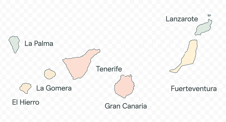 The Canary Islands sit in the Atlantic Ocean off the north west coast of Africa and offer warm weather for most of the year, dramatic landscapes and a mix of easy beach resorts and wild natural scenery. Tenerife, Gran Canaria, Lanzarote and Fuerteventura are the best known names, joined by the greener and quieter islands of La Palma, La Gomera and El Hierro. Each has its own character, from black sand coves and sandy bays to volcanic parks, forests, fishing harbours and small villages.